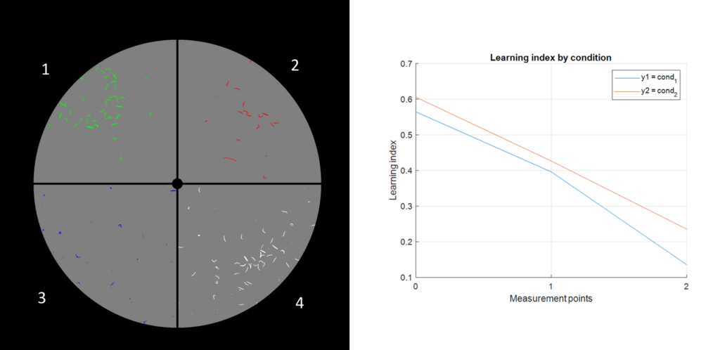 A memory assay has been validated in which a chemical is added to the quadrants where C. elegans feed (1 and 4). Initially, a training phase is performed where they learn to associate the presence of a chemical with food. However, this learning is lost over time.